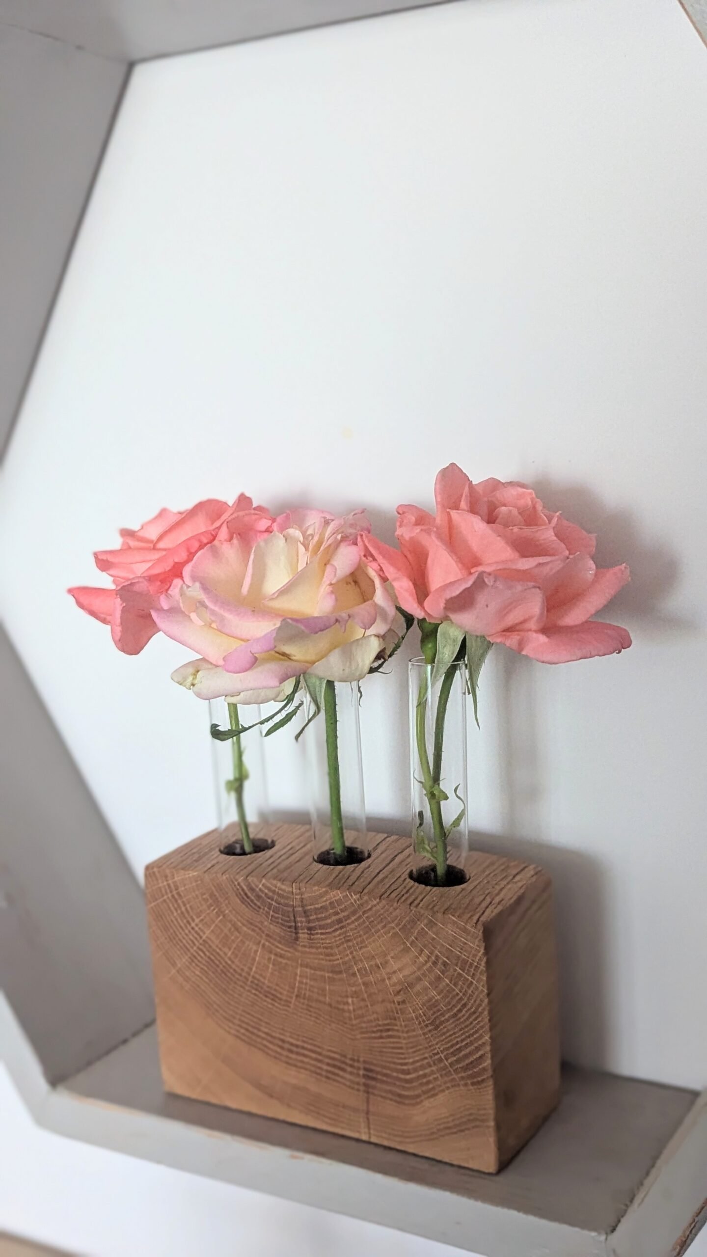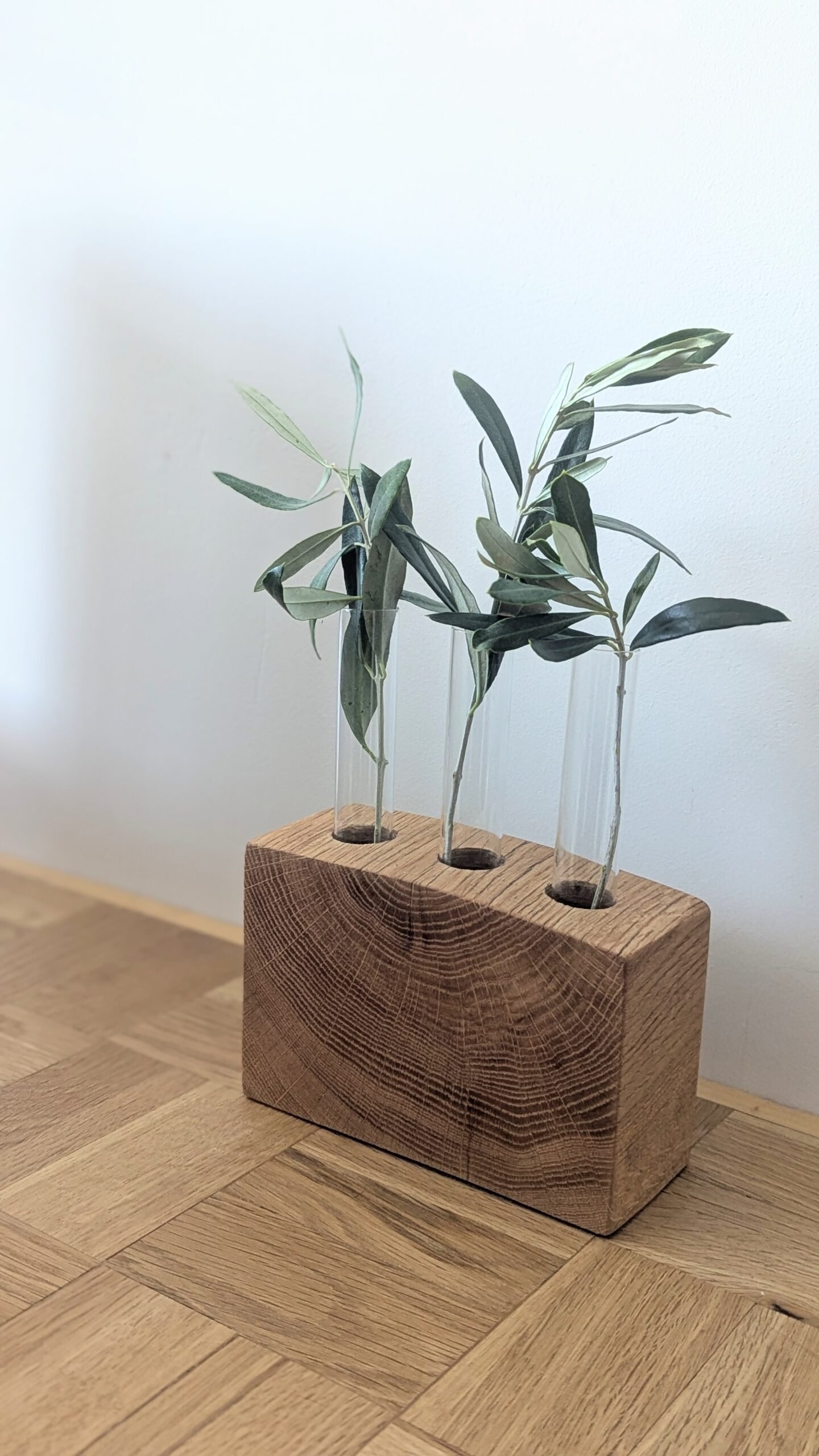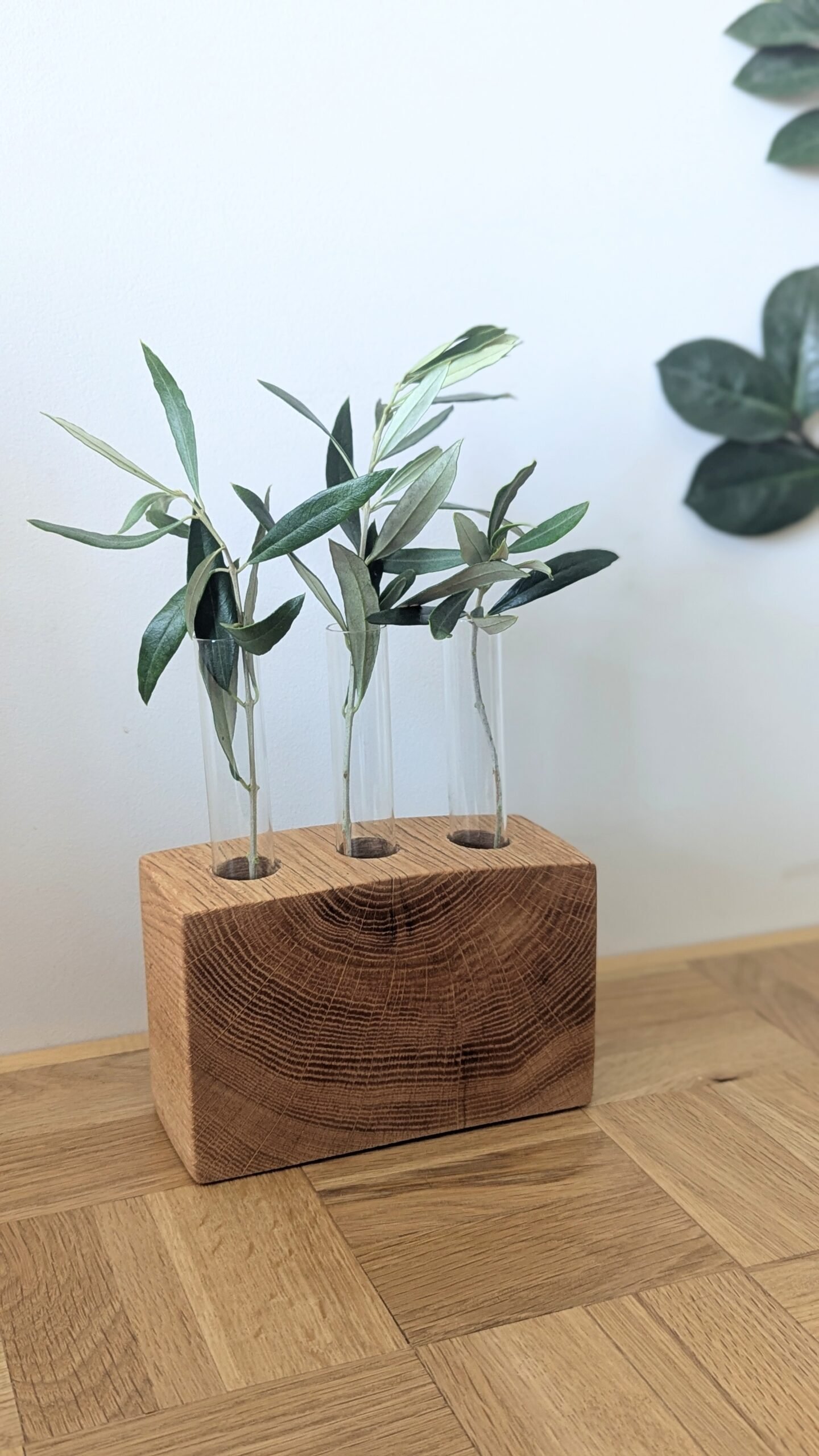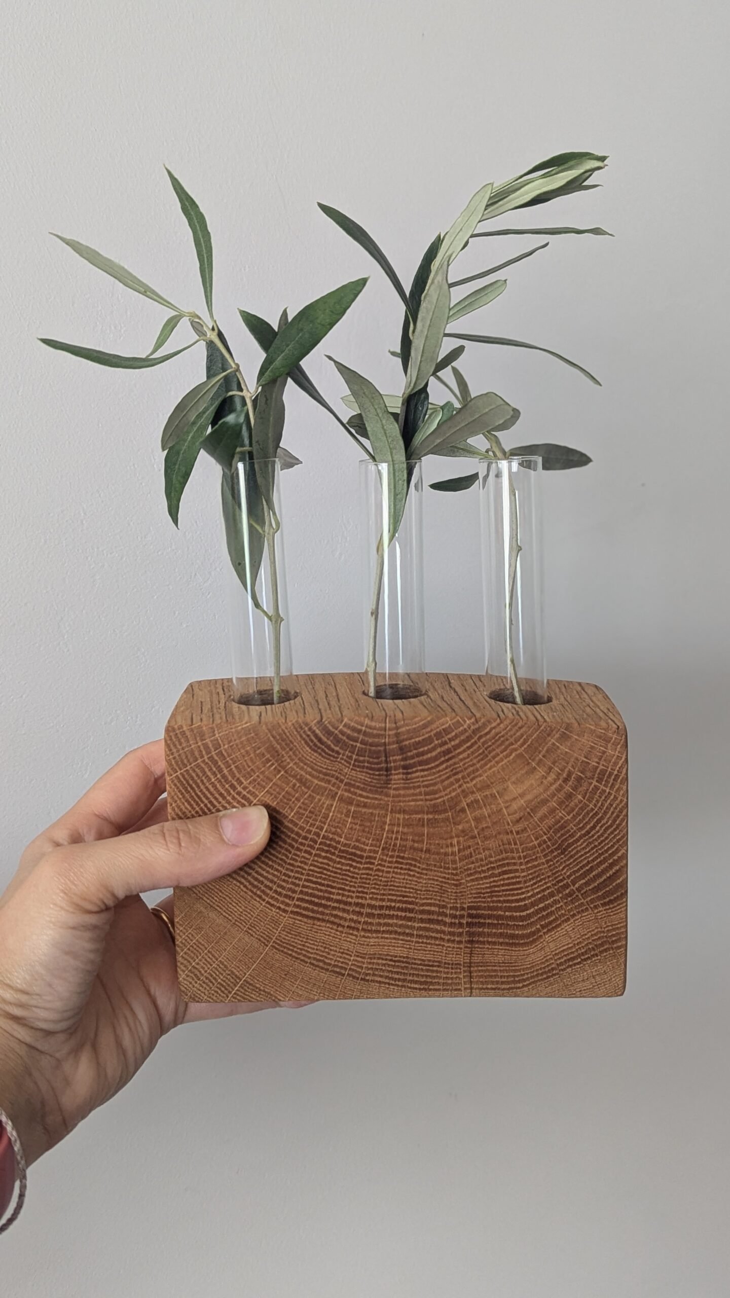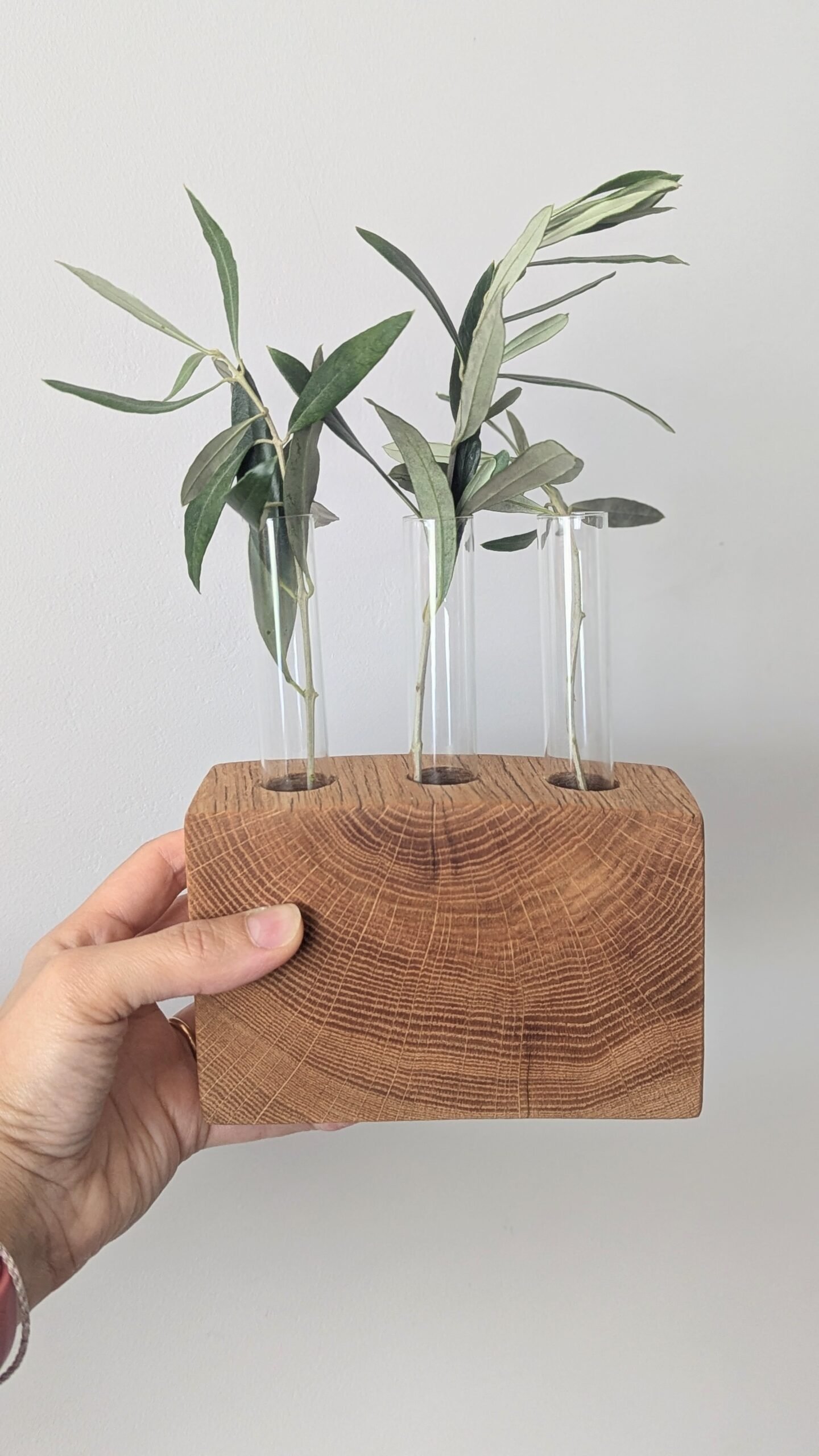 Oak propagation station with three tubes for growing, displaying dried or fresh cuttings made from reclaimed oak, with a natural water-resistant seal